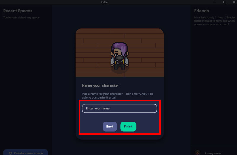 입력한 이름은 나중에 다시 수정할 수 있으니 원하는 이름을 마음껏 사용하셔도 좋습니다. 아바타 생성을 완료하였다면 이제 게더타운에서 활동할 공간을 만들 단계입니다. 앞서 말씀드린 것처럼 다른 분들의 공간에 참여하시는 분들은 공간을 만드시지 않아도 됩니다.