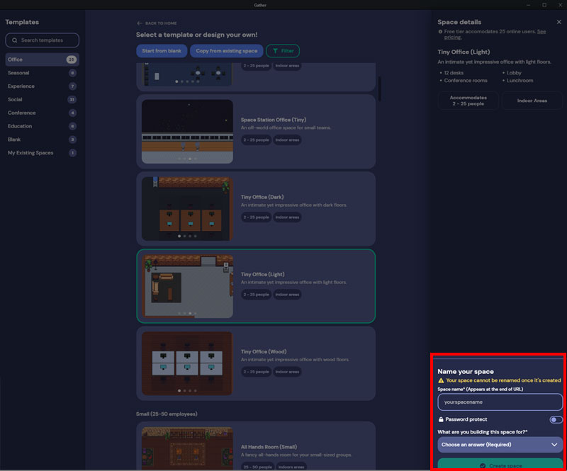 그래서 게더타운에서는 다양한 템플릿을 제공하고 있습니다. 인원 수와 분위기에 맞게 제공되는 템플릿을 클릭만 하면 바로 생성되고 사용이 가능합니다.
